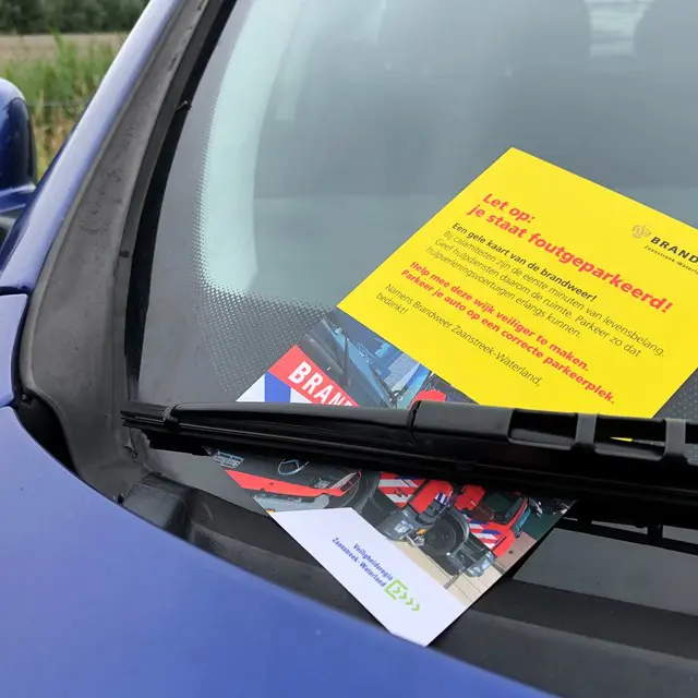Om ervoor te zorgen dat mensen goed parkeren hebben alle brandweermensen de gele kaart bij zich in het voertuig. Tim: “Komen we tijdens een uitruk of oefening een auto tegen die de doorgang belemmert, dan doen we de gele kaart onder de ruitenwisser. Wij proberen met de gele kaart mensen bewust te maken van hun parkeergedrag en eventuele gevolgen. Hou je buurt veilig en parkeer op een correcte parkeerplek!”